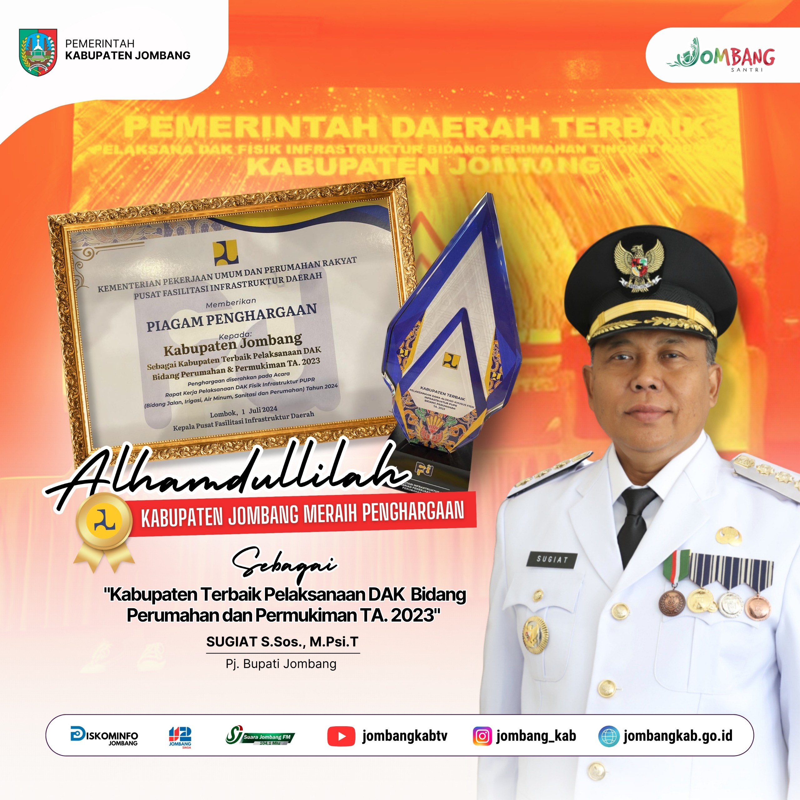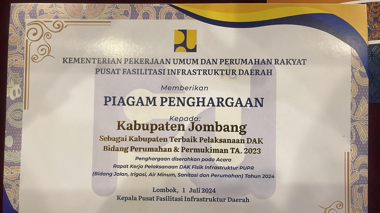 Kementerian Pekerjaan Umum Dan Perumahan Rakyat Pusat Fasilitasi Infrastruktur Daerah memberikan Piagam Penghargaan kepada Kabupaten Jombang, Jawa Timur sebagai "Kabupaten Terbaik Pelaksanaan DAK Bidang Perumahan Dan Permukiman TA. 2023".